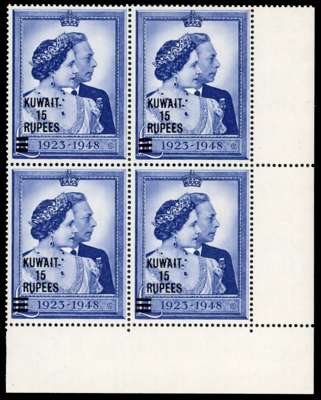 1948 Silver Wedding £1 corner block of four, the top left stamp with R¾ ‘short bars’. Fine unmounted o.g. SG 75, a, £364