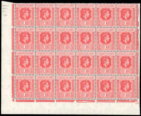 1948 1d red lower four rows of left pane with R7/3 ‘DI’ flaw, o.g., lightly hinged on R7/1 and selvedge only. Small inclusion on the variety stamp. SG 99d, da, £434
