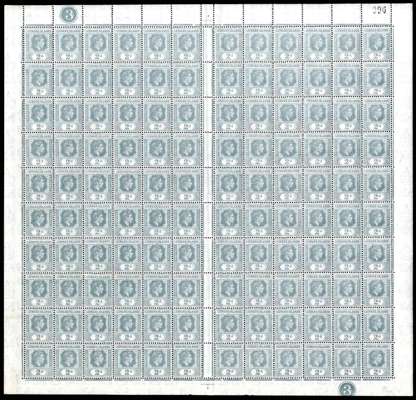 1941 (Aug.) 2d grey, actually a shade of pale slate-grey. Unmounted o.g. sheet of 120 from Plate 3. Many major instances of damage to letters in the name tablet and to the value tablet, a good number listed by Halward, including R9/2 RP short ‘I’, 10/1 and 10/6 major damage to value tablet; no R10/5 keyplate flaw, being from Plate 3. An important multiple for the student of the issue, ex Stuart Stokes. SG 103 (a)