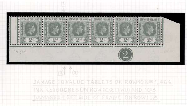 1942 2d olive-grey bottom row of right pane with Plate 2, o.g., hinged on the selvedge only. R10/5 RP serrated edge; also major damage to value tablets on R10/1 and 10/6, and showing hand-painted retouches to the lower right frame on R10/2, and the lower left frame on R10/3. A remarkable piece, ex Harold Green. SG 103a, £275 (for R10/5 alone)