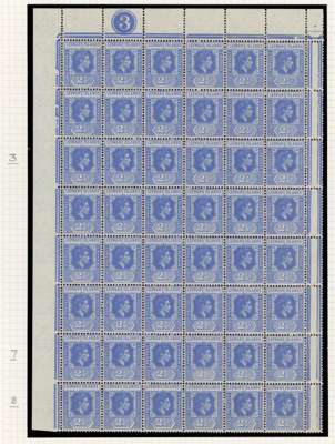 1942 (March) printing of the 2½d top right rows of left pane with Plate 3, unmounted o.g. Shows the major variety ‘partially missing frame’ at top left of R8/3, also other minor varieties including R8/4 damaged first ‘L’. Rare. Ex Harold Green. SG 105a var