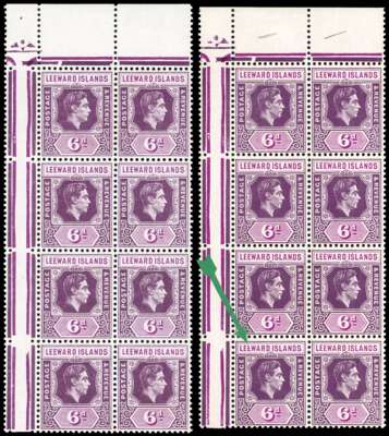 1947-9 6d chalky paper corner block of eight, large part o.g., R4/1 RP broken 'E' (R3/1 corrected). Matched with block showing the R4/1 corrected. SG 109ba, £750