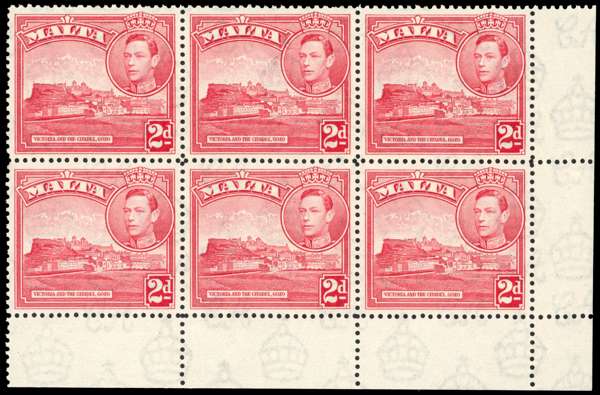 1943-8 2d scarlet corner block of six, R5/8 flag on citadel, fine unmounted o.g. SG 221bb, £130