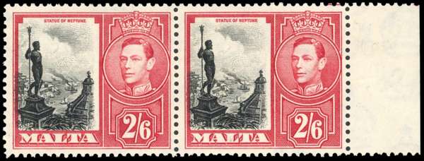 1938-43 2/6d black and scarlet marginal horizontal pair o.g., R4/9 damaged value tablet. Rather extensively hinged, otherwise fine. SG 229a, £400