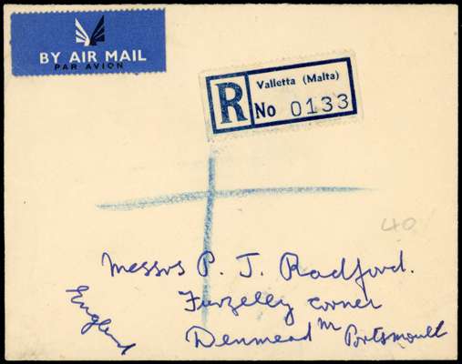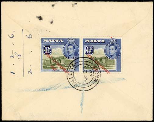 1953 2d yellow-ochre on local cover used at Valletta, showing a substantial pre-printing paper crease; and 4½d olive-green and deep ultramarine pair used on reverse of registered airmail envelope to England showing the overprint dropped so that part of the ‘NT’ falls off the base of the stamps. Ink jotting alongside. Two unusual covers. SG 238c, 241a vars