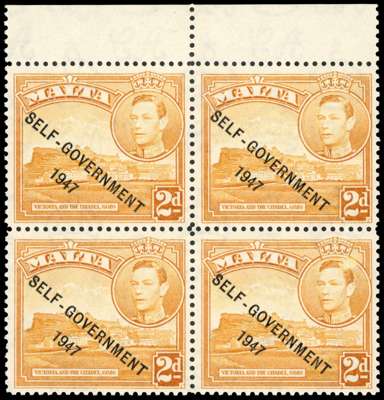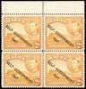 1948-53 New Constitution 2d yellow-ochre top marginal block of four, lower right stamp with R2/5 halation flaw, hinged on one normal stamp with the variety unmounted o.g. SG 238ca, £225