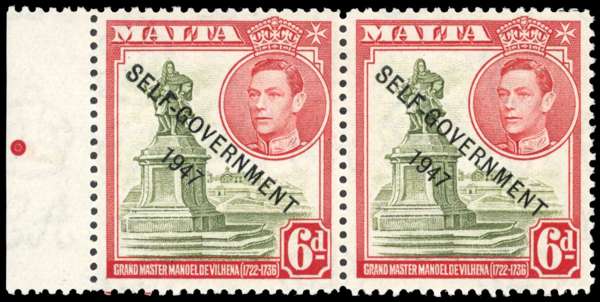 1948-53 New Constitution 6d marginal pair, R3/1 repaired ‘F’, fine large part o.g. SG 242b, £160