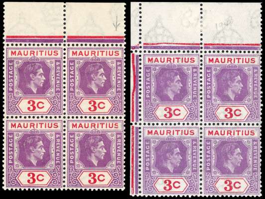 1938 and 1943 3c top marginal blocks of four, R2/2 RP sliced ‘S’. The 1943 block hinged on the selvedge only, otherwise unmounted o.g. SG 253a, da, £310