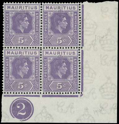 1943 5c pale lilac lower right corner block of four with Plate 2, R10/5 serrated edge, fine unmounted o.g. Also shows fine damage to the first ‘U’ on R9/5 and damaged ‘S’ on R10/6, possibly touched in by hand. SG 255ba, £250
