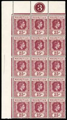 1947-9 25c on chalky paper, late printing with white gum. Top left corner block of fifteen with Plate 3, unmounted o.g. SG 259, £345
