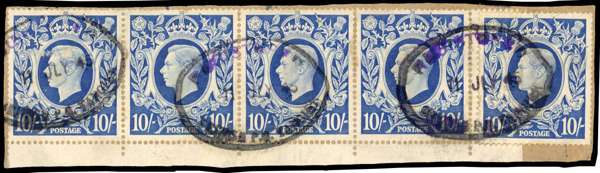 GB used in. 1939-42 10/- ultramarine bottom marginal strip of four and single, on piece with three strikes of Tangier Registered oval datestamp of 11 JY 45 (partially in violet ink). A fine commercial piece. SG Z196, £275