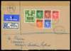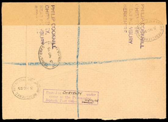 British Currency. 1949 2/6d with R1/7 major re-entry on cover with 1951 ½d to 2½d, registered from Tetuan, registered oval cancels of 3 NO 55. Philatelic, but the 2/6d re-entry very scarce in used condition (CW 16a). SG 92 var, 94-8