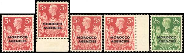 British Currency. 1949 2/6d large part o.g. with R1/7 re-entered shield and left frame (CW B16a). Also four 5/- varieties, all unmounted o.g.; marginal example with R2/8 re-entering to left frame and shading on lion; R3/6 (pane 10) re-entering to lion; lower marginal example with R5/3 (pane 11) re-entering to lion and upright of ‘T’ guideline at base, and major left frame re-entry from R5, ex Bater (the only example known to him) and Bishop. SG 92-3