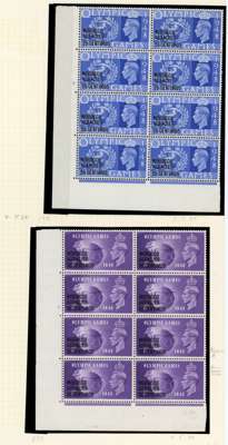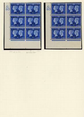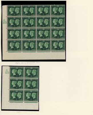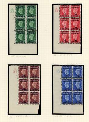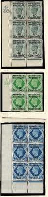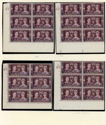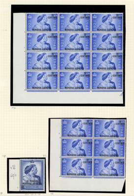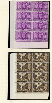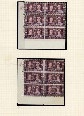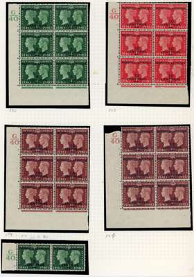 Spanish Currency. 1937-56 Cylinder blocks mint. 1937 set of seven in blocks of six (save the 70c a block of four), condition varied, the 40c block hinged on two stamps; Coronation #s 2., 3. (2), 7., 8., 20. (2), 23.; Stamp Centenary 5c 3 and 3. (2), 1d 2., 1½d 3, 3., 2½ 2. (R20/2 neck retouch), 5.; Wedding 2½d 1, 4, £1 1. (single); Olympics, 3d block with Crown flaw but with self-adhesive hinge remnants; 1952 ½d 151, 155, 10c - 40c blocks of four. QE values include 10c R18/2 shamrock flaw. Mostly hinged and condition a bit mixed
