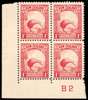 1936 Single watermark 1d perf 13½ x 14 Plate 2B block of four. Unmounted o.g., excellent appearance but the gum is very heavily two-toned. A rare Plate block. SG 557b, CP L2b, $2600