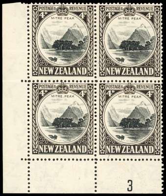 1941 4d Multiple watermark, line perf 14 Plate 3 block of four, o.g., crease through the upper pair, bend affects lower left stamp with the lower right stamp fine unmounted. Fine appearance, ex Baillie. SG 583c, CP L7c, $3000