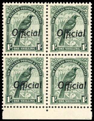 Officials. 1936 Single watermark 1/- block of four, fine o.g., hinged on one stamp only. SG O118, £320