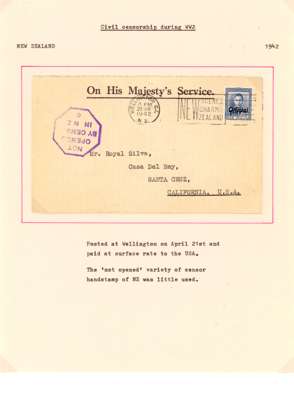 Officials. 1941 airmail OHMS envelope to UK with unusual franking of 2/- Pictorial and Centennial 9d (2) , Wellington CDSs 13 AU. Backflap missing. Routed via Khartoum, Lagos, Bathurst and ‘West Africa Flying Boat’. Also 1942 OHMS envelope to California with Official 3d King's Head, octagonal violet NOT/ OPENED/ BY CENSOR/ IN N.Z./ 6. Ex Ian Warn