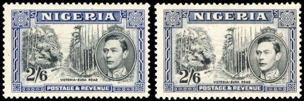 1947 2/6d black and deep blue large part o.g., showing the exceptionally elusive ‘cataract’ variety (the iris of the King's left eye appears almost white). With normal perf 13½ stamp for comparison. SG 58ab var