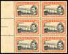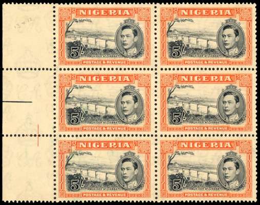1938 5/- perf 13 x 11½ marginal block of six unmounted o.g., gum quite brown but a scarce multiple. SG 59, £660