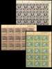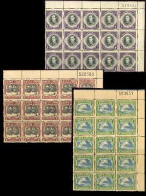 1938 1/-, 2/- and 3/- Single watermark top right corner blocks of fifteen with sheet numbers, unmounted o.g., 3/- paper slightly toned but with good gum; unusual multiples. SG 75-7, £900