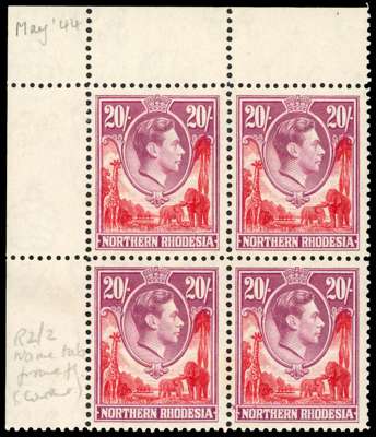 1938-52 20/- carmine-red and rose-purple top left corner block of four with R2/2 large flaw at left of the name tablet, unmounted o.g. Fine but for a little faint foxing on reverse. Pencil notations on selvedge include release date ‘May 44’. SG 45 var