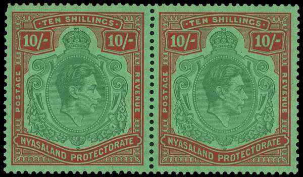 1938 10/- bluish green and brown-red on pale green ordinary paper, fine unmounted o.g. horizontal pair. SG 142a, £850