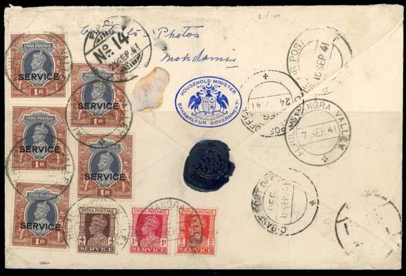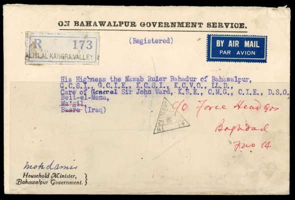 1941 registered envelope to the Nawab at his wartime posting in Iraq, forwarded on arrival, from his Household Minister (crest on backflap). Bears India Service 1a, 2a, 4a and 5 x 1r cancelled Alhilal Kangra Valley 7 SEP on reverse, cancels include FPO 14 and C-Base Post Office. Alhilal registered label on front and Censor 14