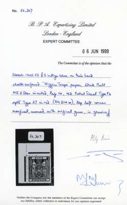 1845-53 Arms £5 Multiple watermark inverted. top left corner example, hinged on the selvedge only. BPA Certtificate (1999), ex Baillie. SG 214w, £425