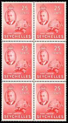 1952 25c vermilion block of six, middle left stamp with error St Edward's Crown in watermark, unmounted o.g. SG 164b, £450
