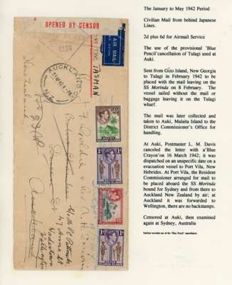 1942 airmail envelope (8½ x 4") to New Zealand, franked at 8d (2d plus 6d airmail). Sent from Gizo to Tulagi, whence to Auki where the Postmaster cancelled the stamps with a blue crayon ‘Tulagi 16.3.42’ (the earliest recorded use of the ‘Blue Pencil’ cancellation). It was routed via Port Vila and Sydney, thence by air to Auckland; doubly censored at Auki and Sydney. On Stan Jersey's display page