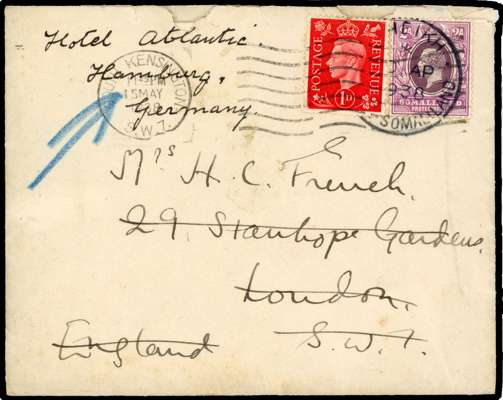 Postal History. 1938 envelope to London bearing KG V 2a tied by Sheikh CDS of 30 AP. On arrival in London, redirected to Hamburg with a GB 1d scarlet added cancelled by South Kensington machine. Includes original letter from Humphrey French to his mother, on Somaliland Camel Corps headed paper, and with the Corps' crest on the backflap. A little roughly opened, but an unusual cover
