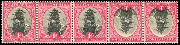 1930-2 1d Type I horizontal strip of five, tête-bêche between the third and fourth stamps. O.g, hinged on the right stamp only, leaving the tête-bêche pair unmounted. SG 43a, £1400