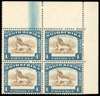 1932-44 1/- watermark inverted corner block of four, R1/5 twisted horn and blue doctor blade flaw (mostly on selvedge). Part o.g. (the variety pair unmounted), gum a little two-toned, a unusual combination. SG 48dw var
