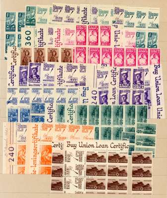 1942-4 bantam War Effort mint blocks, nearly all stamps unmounted o.g. Range on stocksheet, nearly all picked for a reason, with different settings/ slogan colours, including eight sets with extras: featuring missing backgrounds, flaws; includes 2d apostrophe flaw block, line on cap pair (the latter hinged), and 1/- smoking ‘L’ in strip.