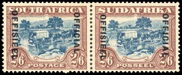 Officials. 1946 unhyphenated 2/6d blue and brown horizontal pair, lightly mounted o.g. The right (Afrikaans) stamp with diaresis over second ‘E’ of OFFISIEEL. Fine and very scarce. SG O19b, £1500