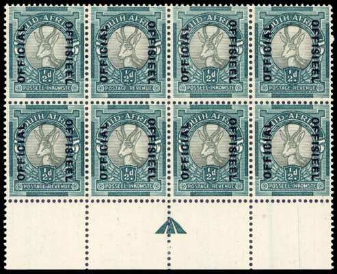 Officials. 1944 ½d grey and blue-green with overprint reading up and down. Lower arrow block of four pairs, lightly hinged on the selvedge only. SG O32, £120
