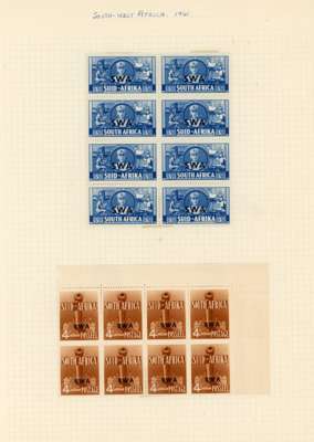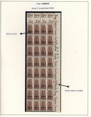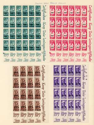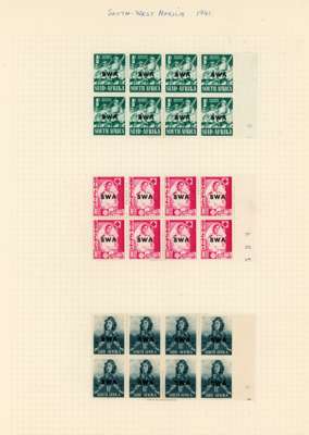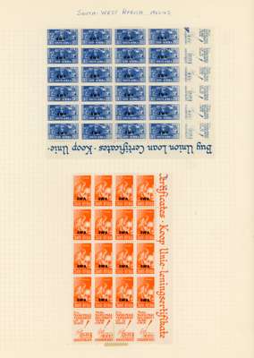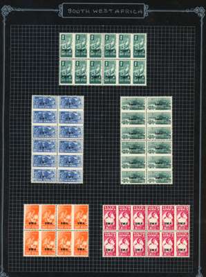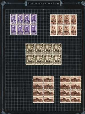 1941-4 War Effort issues in mint multiples, both sets with some unmounted; and two blocks of the bantam ½d, first three and last three columns of the sheet, with significant progressive shift of the overprint, the lower rows showing it partially appearing on the selvedge. SG 114-130b