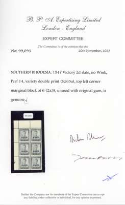 1946 Victory 2d slate with double print (partially inked albino impression), corner block of six, unmounted o.g. BPA Certificate (2023). SG 65a, £21000