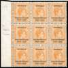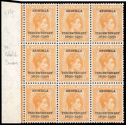 1950 1½d Tercentenary left marginal block of nine, unmounted o.g., showing St Edward's Crown in watermark across the central stamp in the block and the one beneath. Arricator on reverse (stuck to selvedge only) pointing to the error. SG 87b, £1300