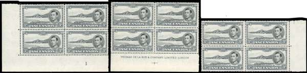 1950 3d perf 13 three positional blocks with the fine sky retouches, o.g. Lower left corner Plate block with R10/2, imprint block with R10/4 (and 10/3 extra rocks), and R6/5; the latter lightly hinged, the others unmounted. SG 42b var, CW 19ab