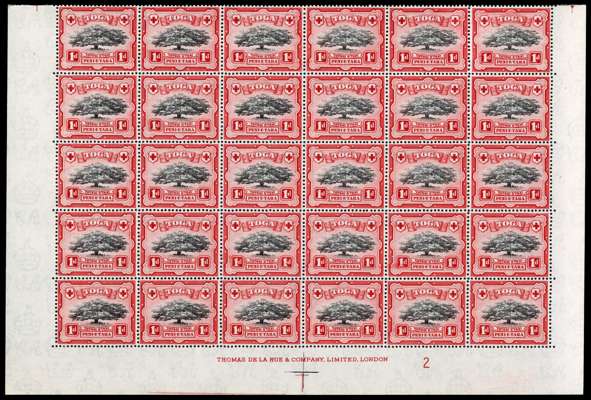1942-9 1d black and scarlet lower five rows of sheet (30 stamps) with R8/5 lopped branch, DLR imprint and Frame Plate 2, fine unmounted o.g., unfolded. SG 75, a, £212