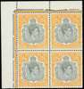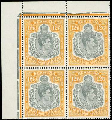 1946 12/6d grey and orange-yellow top left corner block of four, o.g., hinged on the selvedge only. HPFs #1a, 2a joined pearls, 2e and 13. SG 120c, £520