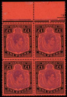 1951 (Nov.) £1 pale violet and black on bright red paper perf 13 top marginal block of four with HPFs #6a, b, 17b and FF #17. O.g., hinged on the front of the selvedge only. SG 121d, £220