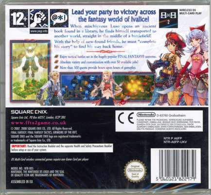 This lot contains a factory sealed copy of Final Fantasy Tactics A2 Grimoire of the Rift for the Nintendo DS. This game is for the PAL region/territory.