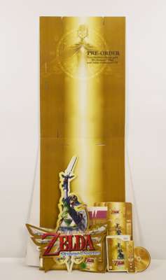 This lot features the official standee/point of sales material supplied to videogame stores for Legend of Zelda Skyward Sword. The item is complete in box and in its original packaging. This is a fold up standee that has many movable/attachable parts and an official store poster.