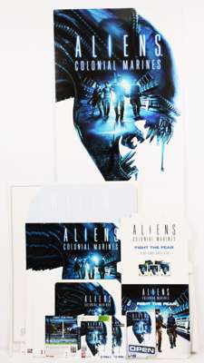 This lot contains the official point of sale material given to game stores to promote the game, Aliens Colonial Marines. It features a 'cube' display, window sticker, posters and game sleeves.