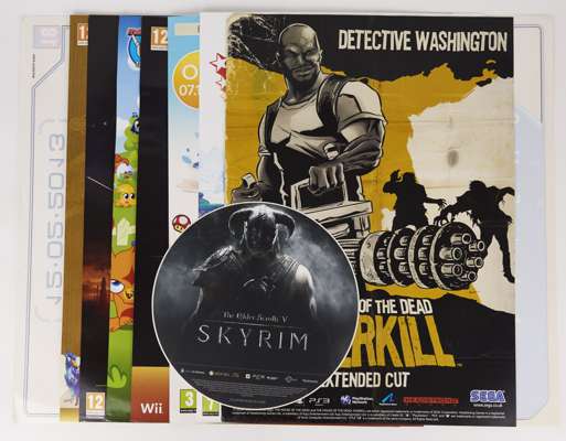 This lot contains a selection of 20 items that feature window stickers and posters exclusively given to videogame stores to help promote new releases. It includes popular titles such as Skyrim, Sonic 20th Anniversary, Bioshock Infinite, Super Mario Land/Mario Kart 7, Kirby's Epic Yarn, Arcana Heart 3, Zelda Ocarina of Time 3ds, Castlevania Lords of Shadows, Fallout New Vegas, Final Fantasy XIV Online, Sengoku Basara Samurai Heroes, Kingdom Hearts Birth By Sleep, The House of the Dead Overkill, Dead Rising 2, Sonic Generations, Pandora's Tower, Super Mario Sticker Star, Moshi Monsters Moshling Zoo, Star Wars the Old Republic, Zelda Skyward Sword and the Alien colonial marines wall sticker! Perfect for decorating that games room!