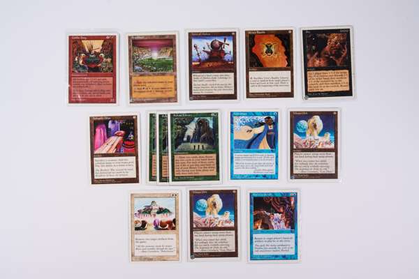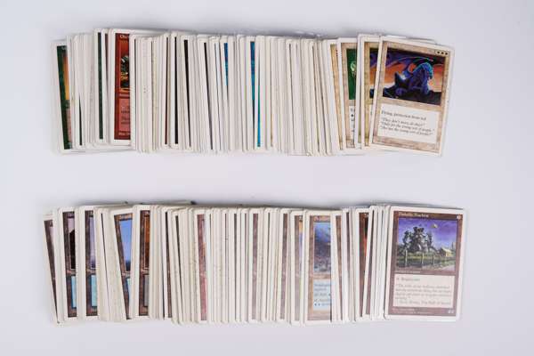 This is a collection of cards from Fifth Edition with various duplicates. Conditions are mostly around Good (GD) to Excellent (EX) with some exceptions. Included in this collection are: x3 Sylvan Library, x2 Winter Orb, Dust to Dust, Ankh of Mishra, Ashnod’s Altar, Urza’s Bauble, Goblin King, Hydroblast, Brusland, and others.This collection also includes a stack of around 140 basic lands, perfect for adding some white-bordered charm to your decks.