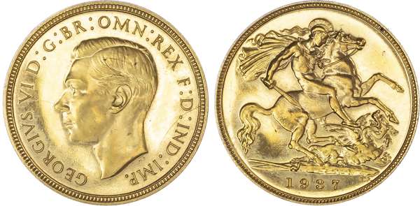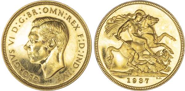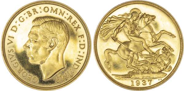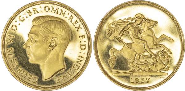 George VI (1936-52), Coronation, 1937, Gold Four Coin Proof Set, five-pounds, two-pounds, sovereign and half-sovereign (4), bare head left, reverse, St. George and dragon right, date below in exergue, with original red Royal Mint case of issue (S. PS15) As struck, with only the minutest of hairlines.